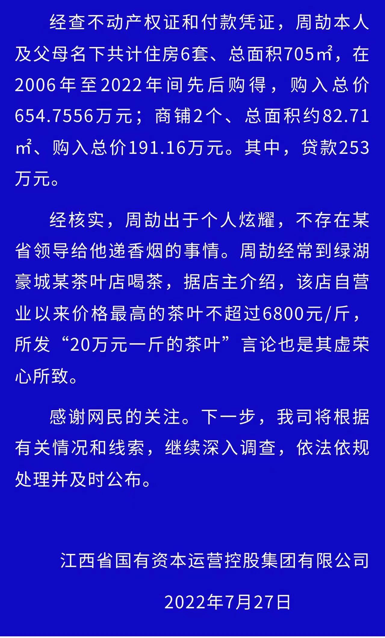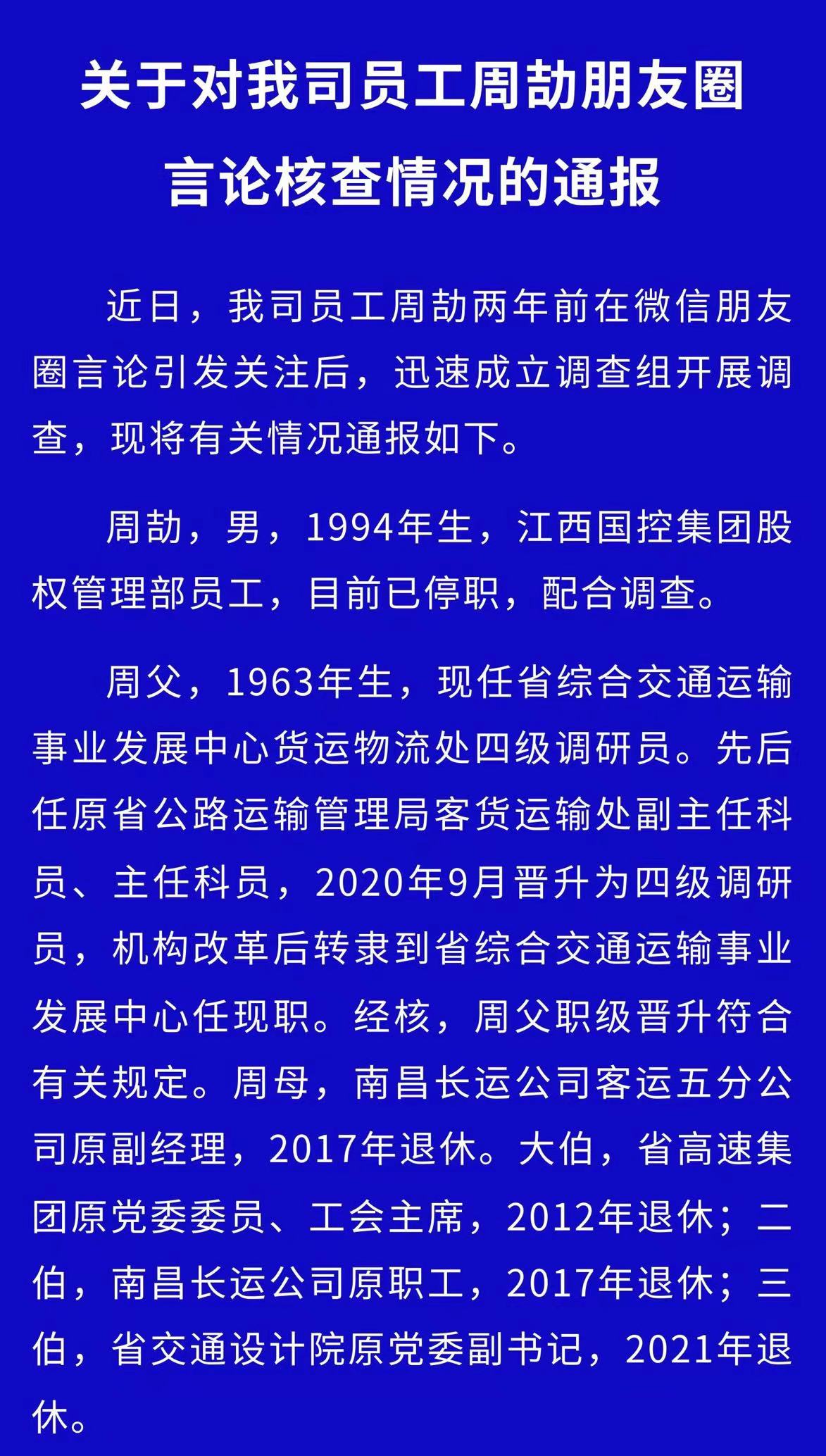 中新网北京7月27日电 27日,江西省国有资本运营控股集团有限公司网站发布《关于对我司员工周劼朋友圈言论核查情况的通报》(以下简称《通报》)。