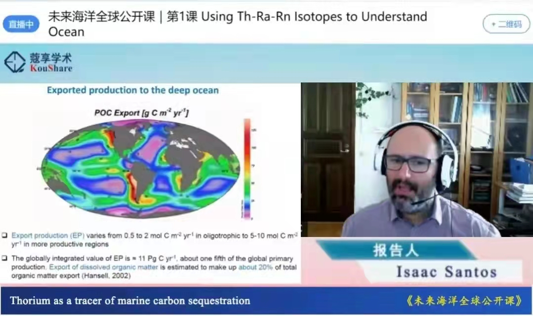 为深入学习贯彻习近平总书记关于海洋强国建设的重要论述和“海洋命运共同体”重要理念,中国海洋大学积极创新拔尖研究生培养和国际合作交流范式,发挥未来海洋学院在国际化拔尖人才培养方面的优势,于7月20日开设国内首门“全球海洋公开课”,由国际著名海洋化学专家、瑞典哥德堡大学Isaac Santos教授与中国海洋大学未来海洋学院导师许博超教授联合讲授“Using Th-Ra-Rn Isotopes to Understand Ocean”(利用钍-镭-氡同位素理解海洋)。