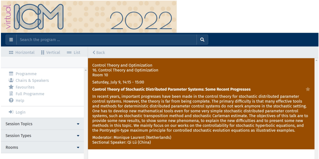 吕琦教授7月9日以《Control Theory of Stochastic Distributed Parameter Systems: Some Recent Progresses》为题作了45分钟报告,分享自己在随机分布参数系统控制理论方面取得的成果与进展。