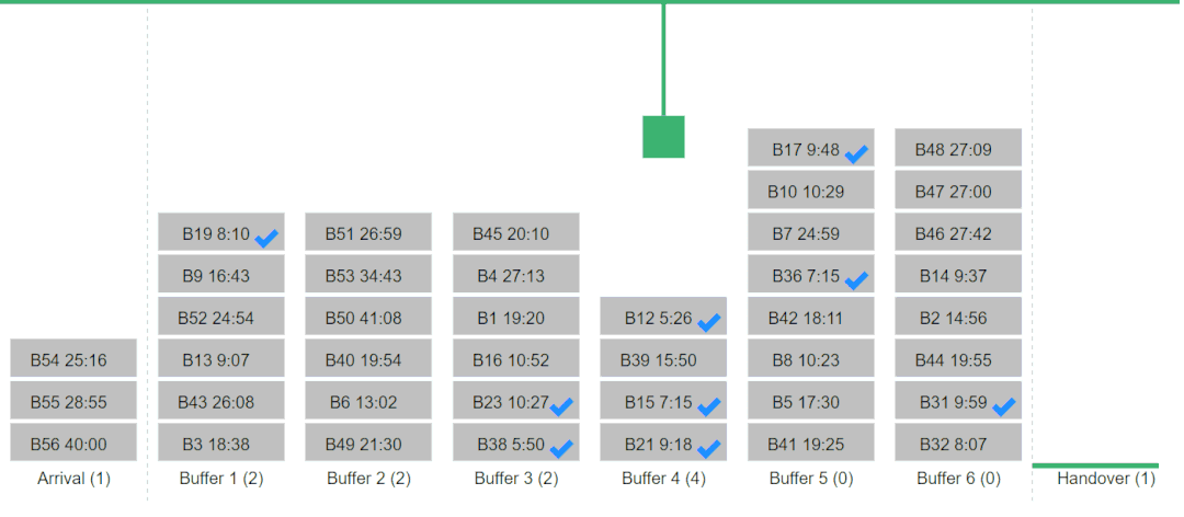 本次竞赛问题是在动态不确定环境下,给定一定数量的堆栈、集装箱和堆吊,每个堆栈可以存放一定数量的带时间窗的集装箱,需要在给定时间窗内将集装箱从达到区经由缓冲区移动至处理区。优化目标是调度堆吊搬运集装箱,最小化到达区的阻塞时间,同时减少超时集装箱的数量和堆吊的移动次数。其中集装箱的到达时间和就绪时间、堆吊的移动时间等都是动态不确定的。Hotstorage赛道中由单个堆吊调度运行,而Rolling Mill赛道由双堆吊同轨道调度运行,且集装箱到达频率更高,可供调度的时间窗更短,动态性更强,极具挑战性。该问题与实际港口调度场景十分贴合,具有重要的研究意义与实际工业应用价值。