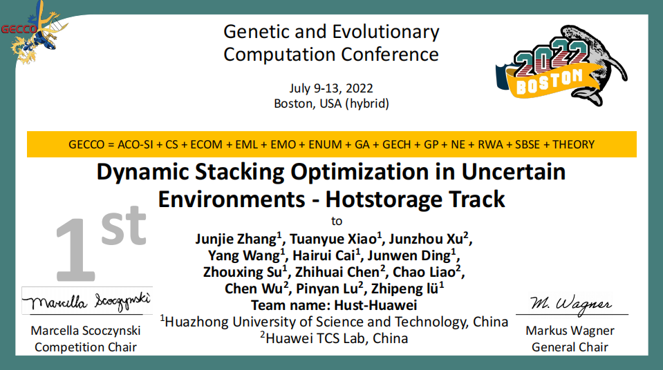 在近日结束的ACM遗传与进化计算国际会议(GECCO 2022)中,吕志鹏团队与华为理论计算机实验室团队组成的联合参赛团队,在不确定环境下动态堆栈调度(Dynamic Stacking Optimization in Uncertain Environments)算法竞赛中斩获Hotstorage赛道和Rolling Mill赛道双赛道冠军。
