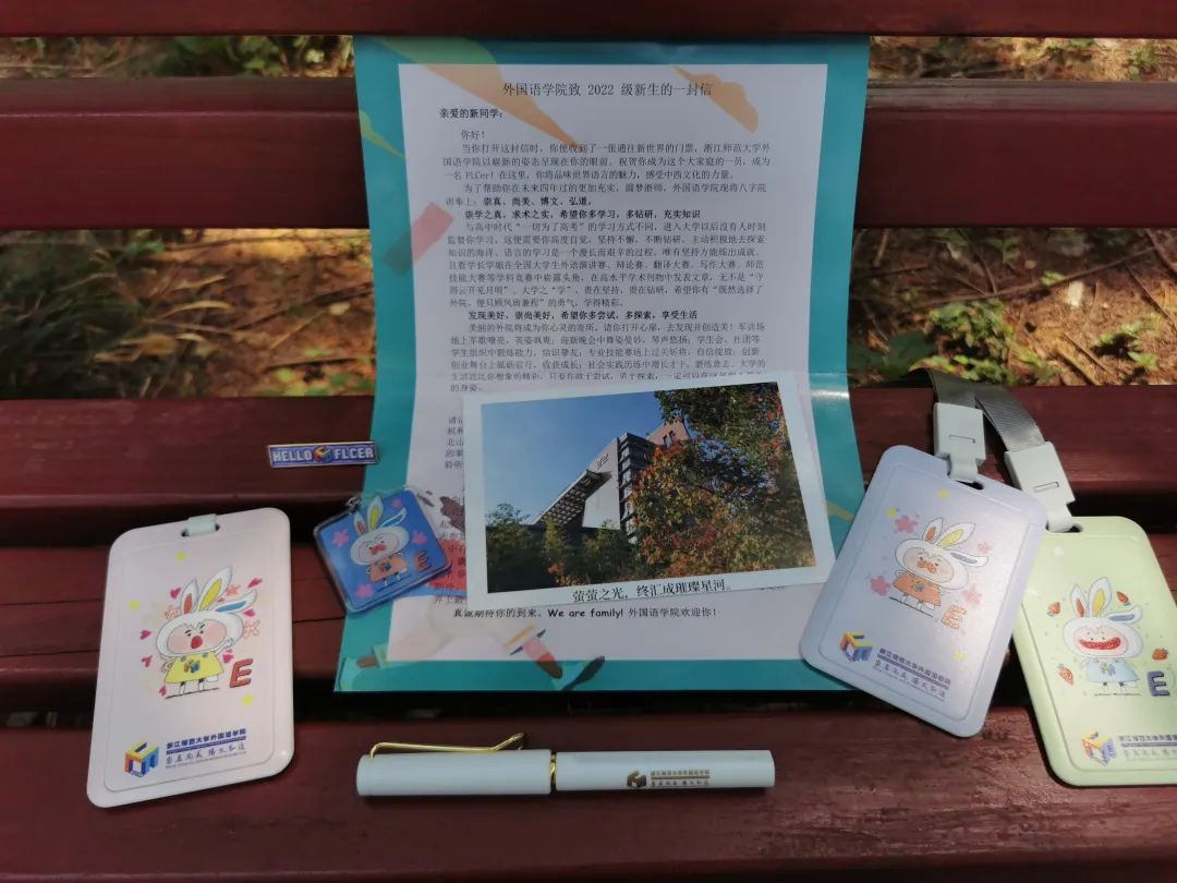 外国语学院为新生定制了精美的E兔校园卡卡套和钥匙扣。以“三耳秀才”为设计灵感,以外院三原色进行色彩搭配,象征着外院人的鲜活情感和生命力。“HELLO FLCER”徽章和外院专属院训笔的设计也别具巧思。此外,还有外院明信片和一封致新生的信,礼物丰富且精致。