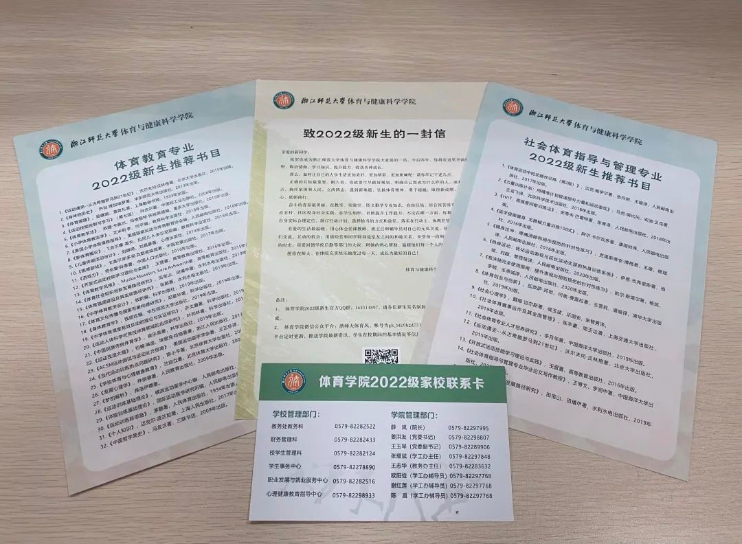 体育与健康科学学院为新生准备了一封信,字里行间充满了学院对新生们的殷切期盼。此外新生还将收到专业推荐书目清单一份,愿新生在新征程中与好书相伴。一张小小的家校联系卡更是包含了对新生的浓浓关怀,希望新生在师大、在体院充实快乐地度过每一天,成为更好的自己。