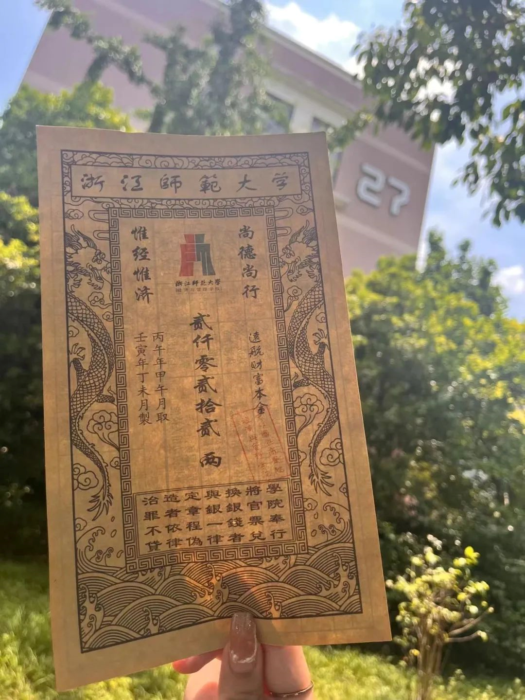 经济与管理学院、中非国际商学院为新生准备了银票一张。银票正面印有校名、院名、院标、院训等,极具学院特色。银票背面还附上了“经彩远航”财富管理表,新生可以依“德智体美劳”五个评判维度,进行自我提升,以更好的面貌踏入校园。