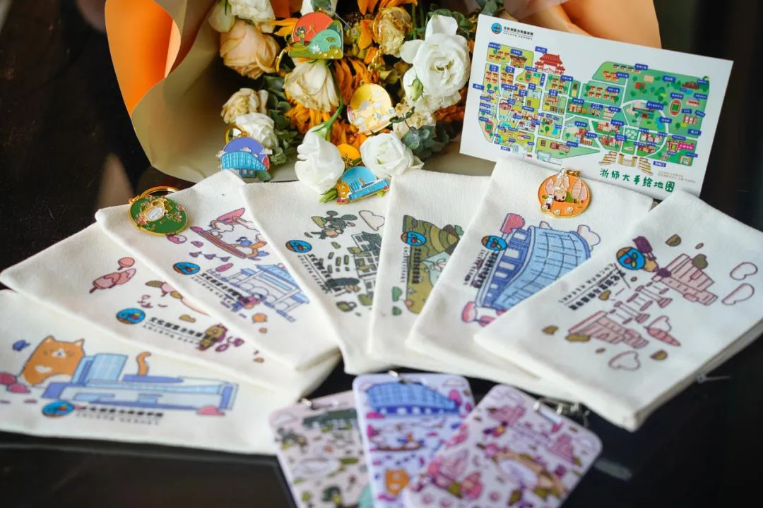 文化创意与传播学院为2022级文传新生准备了新生大礼包。素色打底的笔袋,将翰墨书香装进心底,见证知识与成长;印着校园独特景色的卡套,时时相伴,形影不离;将浙师校园内标志性的景点拆分开,定制七款钥匙扣,展示浙师风光……除此之外,附赠一份精美的手绘地图和专业阅读参考书目,供新生提前领略浙师全景,开启创意之旅。