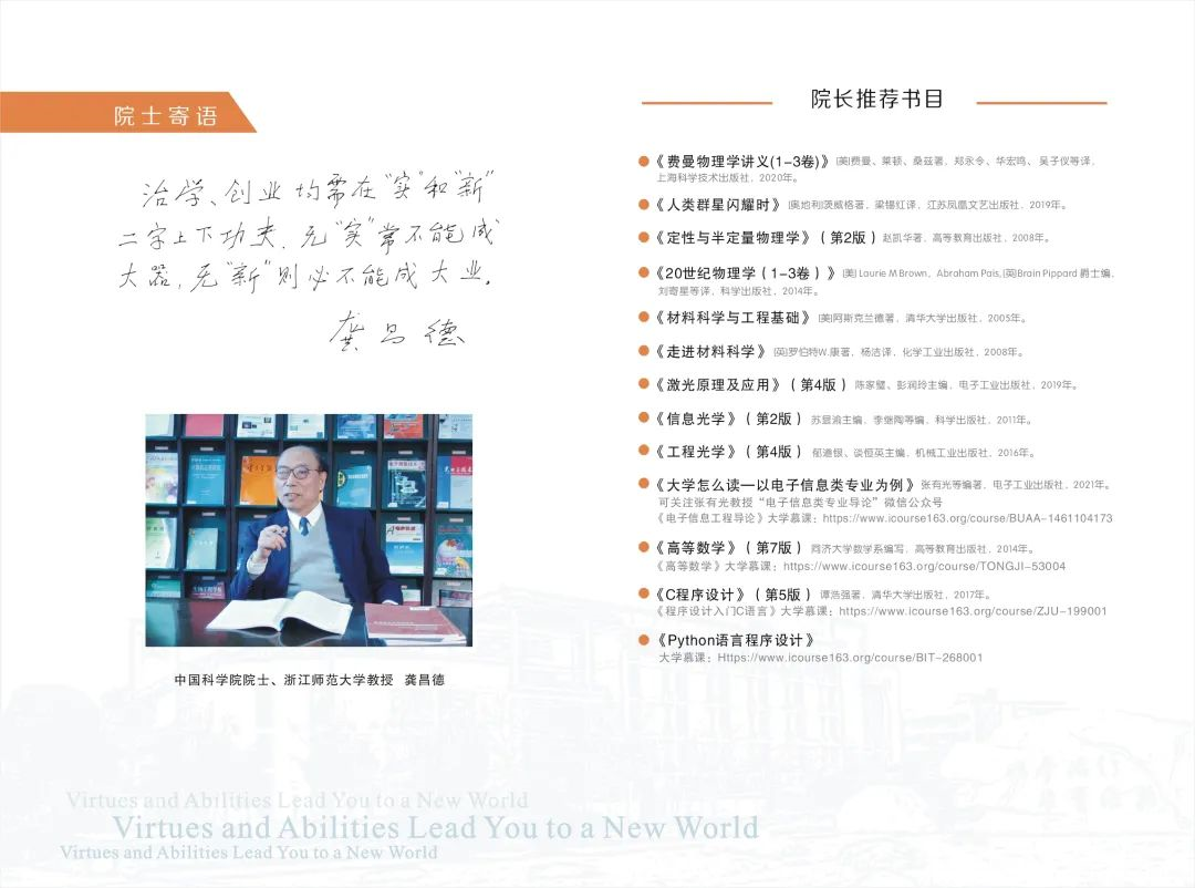 物理与电子信息工程学院为新生准备了龚昌德院士的寄语,言语中满是期许,希望学子们在治学和创业上都能做到“实”和“新”。院长也为各位新生精心挑选了推荐书目,希望各位学子能在假期也有所收获。