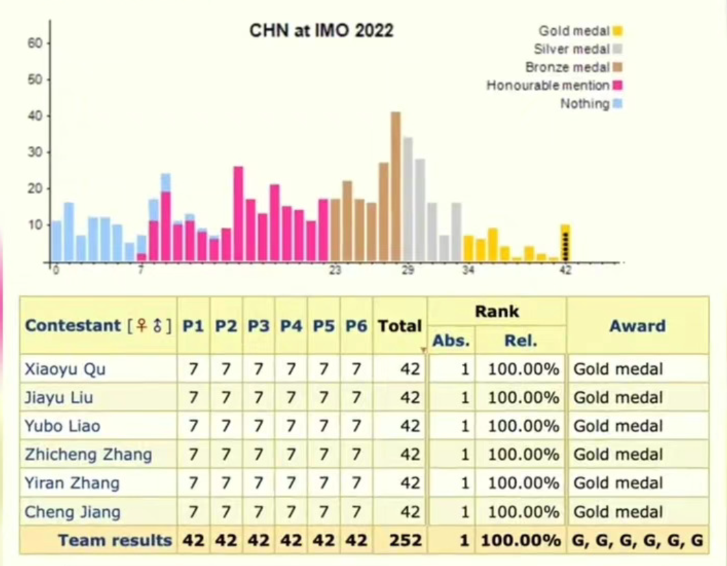 2022年,入选国家队,出征第63届国际数学奥林匹克赛场,与其他五名中国国家队队友分别同时斩获满分,以252分的成绩获团体总分第一名,获国际金牌。