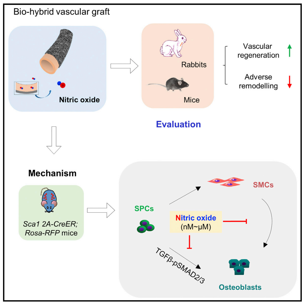 结果显示:NO通过调控SPC向血管内皮细胞方向分化并抑制其向成骨分化,从而起到促进血管再生、抑制血管钙化的作用。进一步研究还发现,NO对于SPC向成骨细胞分化具有双向调节作用,低浓度(nmol~μmol)NO可通过调控TGF-pSMAD2/3信号通路,抑制SPC向成骨细胞分化,进而减少血管钙化形成;而高浓度NO(mmol)则起到截然相反的作用。这些研究结果充分证明NO在调控血管干/祖细胞命运、改善血管组织再生方面具有重要作用,缓释NO的生物复合型人工血管具有良好的临床转化前景。