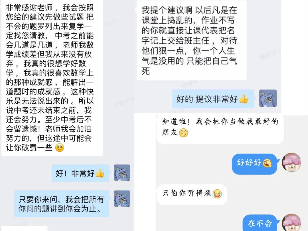 最让我难忘的一次工作调整是距离支教结束还有两月有余时,当时我带的是八年级两个班的物理,因为学校部分老师的离职导致了人手不足,于是校长找到了我,需要我带九年级两个班的数学,我第一反应是打退堂鼓——要知道接受这份工作,就意味着每个星期要比原来多一倍的课时,还有晚自习、早自习、周末补课、模拟考试等等,再加上当时我还负责全校师生的饭卡管理工作,而九年级又是即将中考的关键点。我不是害怕工作繁重,而是真的担心万一因为我这两个月没有带好数学这一门主课,影响了学生们的成绩,进而影响他们的人生轨迹。