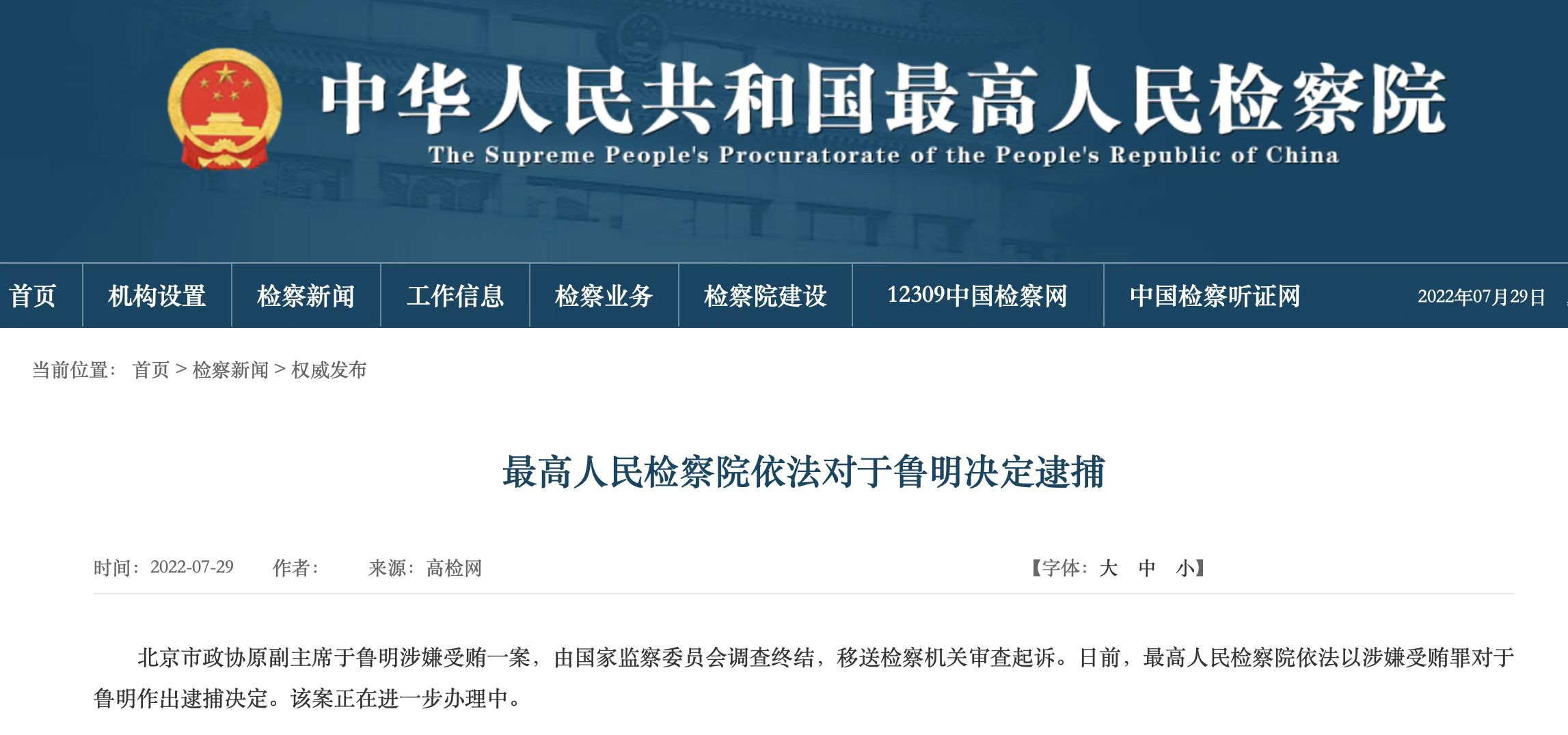 最高检依法对北京市政协原副主席于鲁明决定逮捕