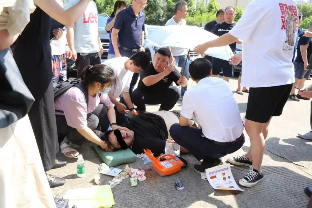 发现异常情况的其他师生也纷纷聚集过来,有人主动替换姜燕给病人做心肺复苏,有人拿来了日常配备用于应急的AED设备,有人负责观察病人面色,有人负责清理口鼻异物,有人撑着伞给病人遮住毒辣的阳光。在大家的共同努力下,病人状态趋于稳定,被护送往医院并成功获救。