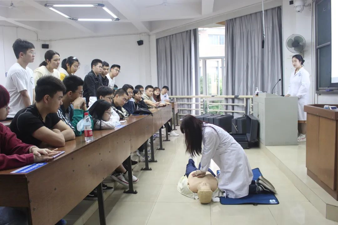 为了真正实现急救知识培训的校内全覆盖,湘雅护理学院联合“健康中南”团队院内校内两手抓:一方面,在院内专业课堂教学中有针对性地加强心肺复苏、基础生命体征测量等实操技能的训练;在护理人文修养课程中深化思想价值引领,培养学生人文情怀和大爱精神,全面提高学生的专业素养和服务意识。另一方面,面向全校开设《急救事故与安全教育》、《向死而生——生命教育》等公选课程;组织新生急救知识技能培训、安全教育体验馆、主题团日活动等志愿服务活动,增强大学生健康安全意识。