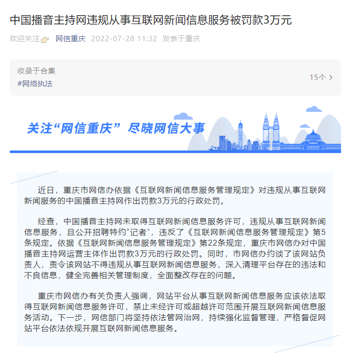 近日,重庆市网信办依据《互联网新闻信息服务管理规定》对违规从事互联网新闻服务的中国播音主持网作出罚款3万元的行政处罚。