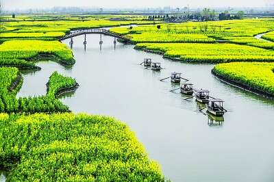 “河有万湾多碧水,田无一垛不黄花。”每年四月左右,江苏兴化,油菜花绽放,铺洒开来的金黄和蓝天碧水相映成趣,块块垛田宛如一座座小岛,游客可乘船在交错的港汊中穿梭,也能钻进垛上的油菜花田沉醉其中。在云南,层层叠叠的红河哈尼梯田,以丰富的色彩和如画的风景诠释了何为“大自然打翻了调色盘”,呈现了“大地雕塑”这一绝美的艺术品。