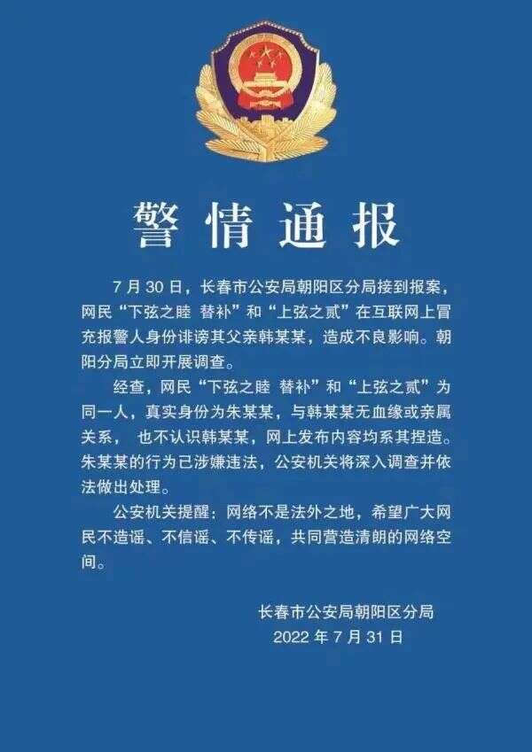 今天,长春市公安局朝阳区分局发布通报:7月30日,长春市公安局朝阳区分局接到报案,网民“下弦之睦 替补”和“上弦之贰”在互联网上冒充报警人身份诽谤其父亲韩某某,造成不良影响。朝阳分局立即开展调查。