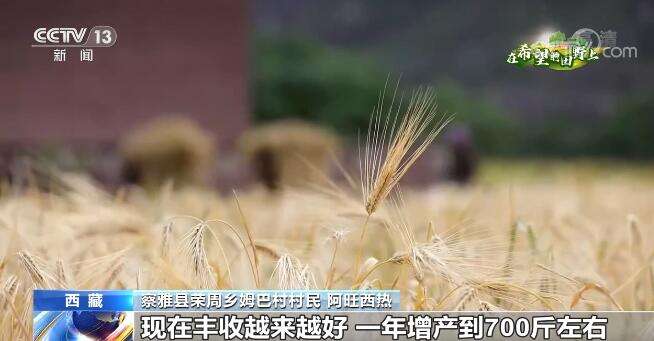 察雅县荣周乡姆巴村村民 阿旺西热:咱们姆巴村这边,过去种青稞一亩地只能产400斤左右,现在丰收越来越好,一年增产到700斤左右,我这有6亩地,一年大致能收获4200斤左右的青稞。