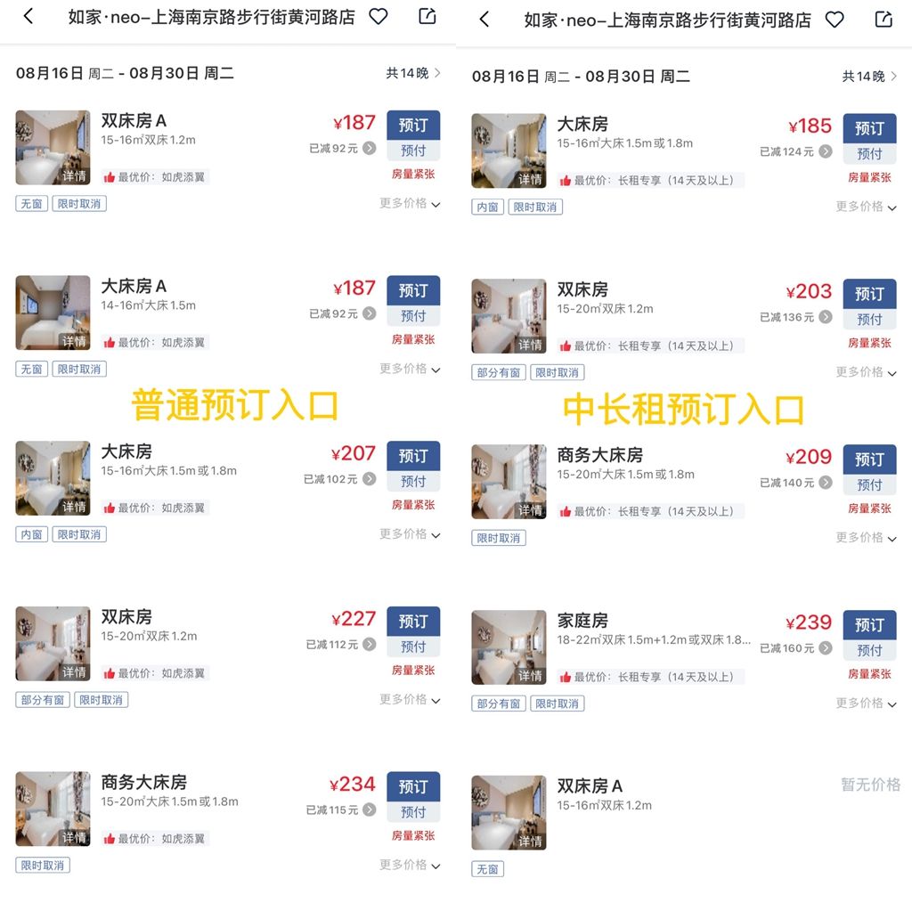 澎湃新闻搜索首旅如家APP发现,以如家·neo上海南京路步行街黄河路店为例,从普通预订入口预订8月16日至8月30日入住共14晚的大床房价格为207元/晚(仅入住一晚价格也相同);而从中长租预订入口预订同样时长的大床房价格为185元/晚,长租价格为门市价的9折左右。