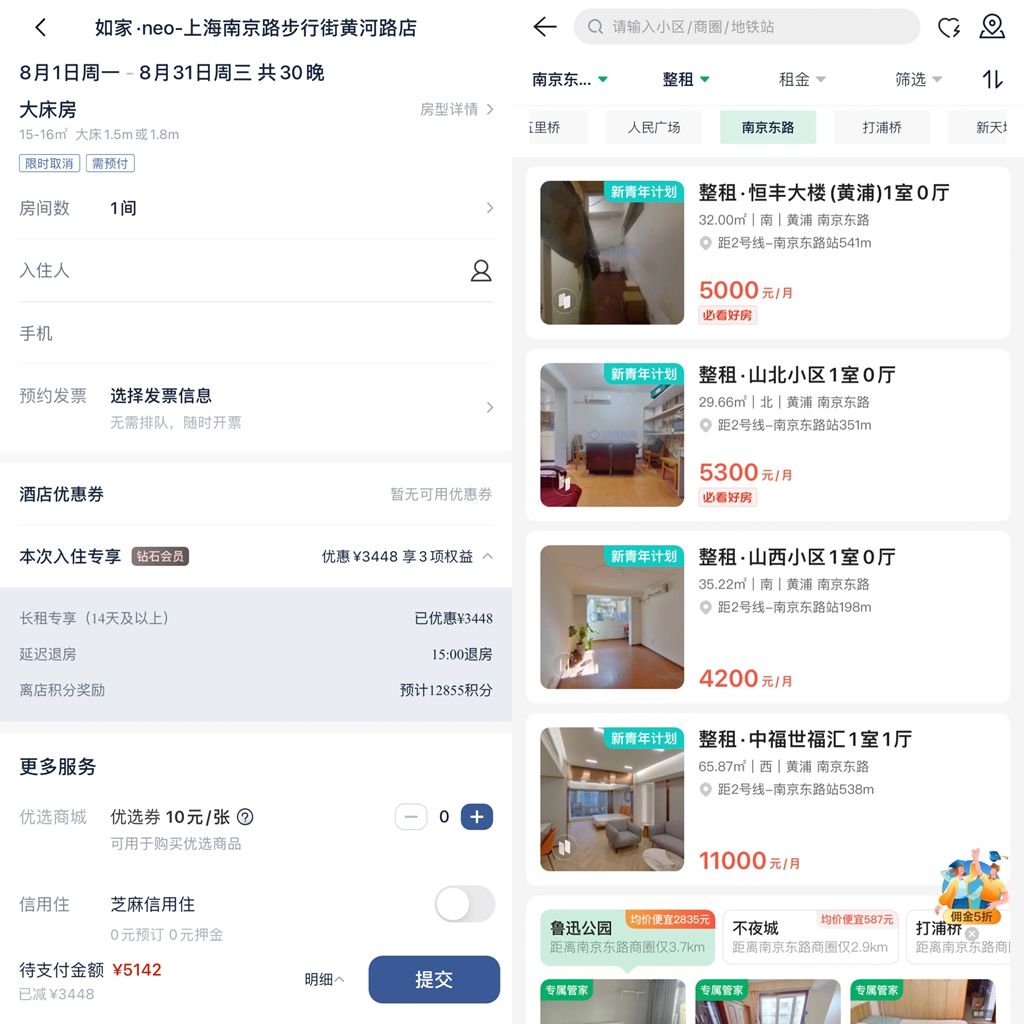 澎湃新闻搜索发现,在个别区域,长租连锁酒店的费用可能更划算。如以南京东路为例,链家平台显示,距离南京东路地铁站200-500米、面积在30平米上下的一居室整租价格在4000-5300元/月,押金同租金;而以如家·neo上海南京路步行街黄河路店为例,8月1日至8月31日入住30晚的15-16平方米大床房价格为5142元,距离南京东路地铁站约500米左右。