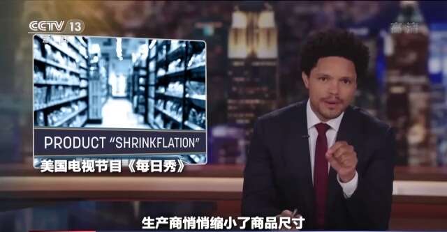美国电视节目《每日秀》主持人:生产生悄悄缩小了商品尺寸,但你还付那么多钱,你可能已经注意到了,对吗?那天你买了一大包薯片,每个人都能分享,最近你打开了那包薯片,而里面只有一片,撑起了整个包装袋。