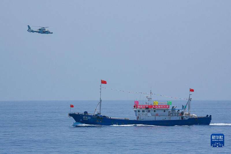 中国海军第40批护航编队中的舰载直升机在被护船只周边海域巡逻警戒(2022年6月4日摄)。新华社发(唐文 摄)