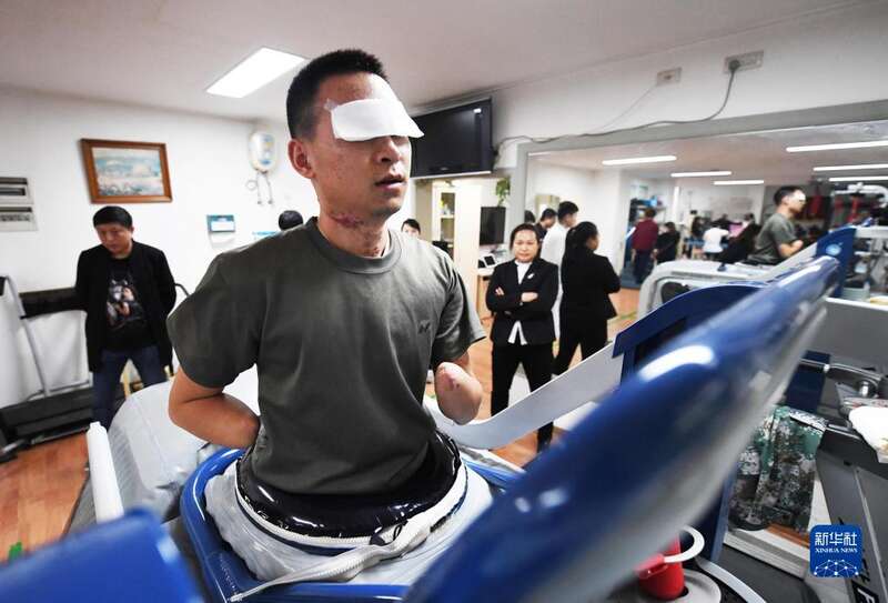 在陆军军医大学康复中心,杜富国在跑步机上进行训练(2019年4月15日摄)。新华社记者 张永进 摄