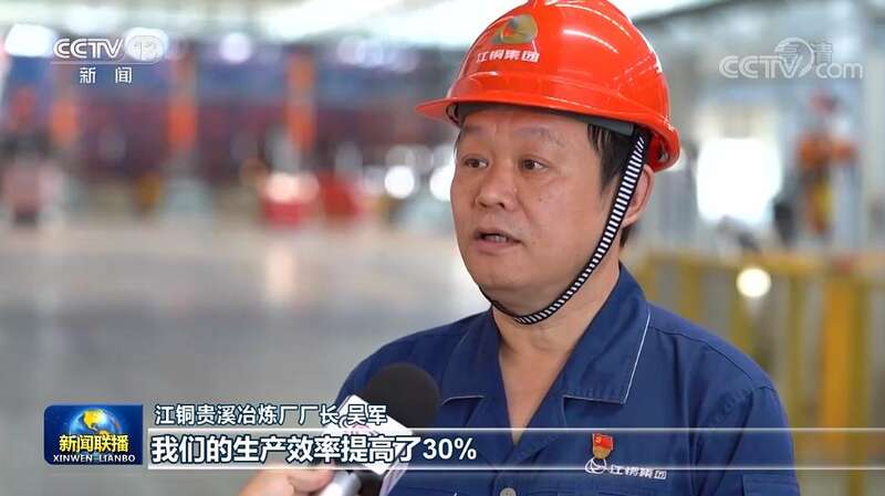 江铜贵溪冶炼厂厂长 吴军:我们的生产效率提高了30%,综合能耗也下降了7%,每年能为企业创造6000万(元)以上的经济效益。目前,我们有五项核心指标位列世界第一。