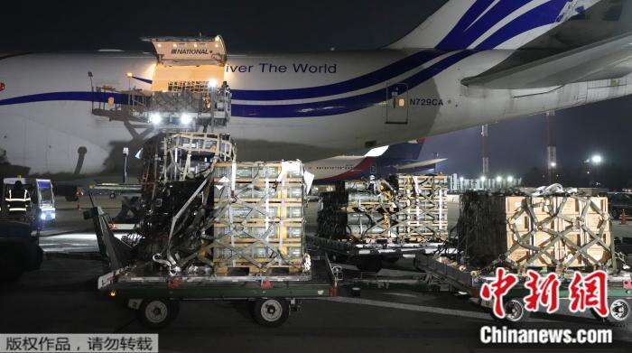 2022年1月25日,乌克兰基辅鲍里斯皮尔机场,工人们正在卸下美国向乌克兰提供的军事援助物资。