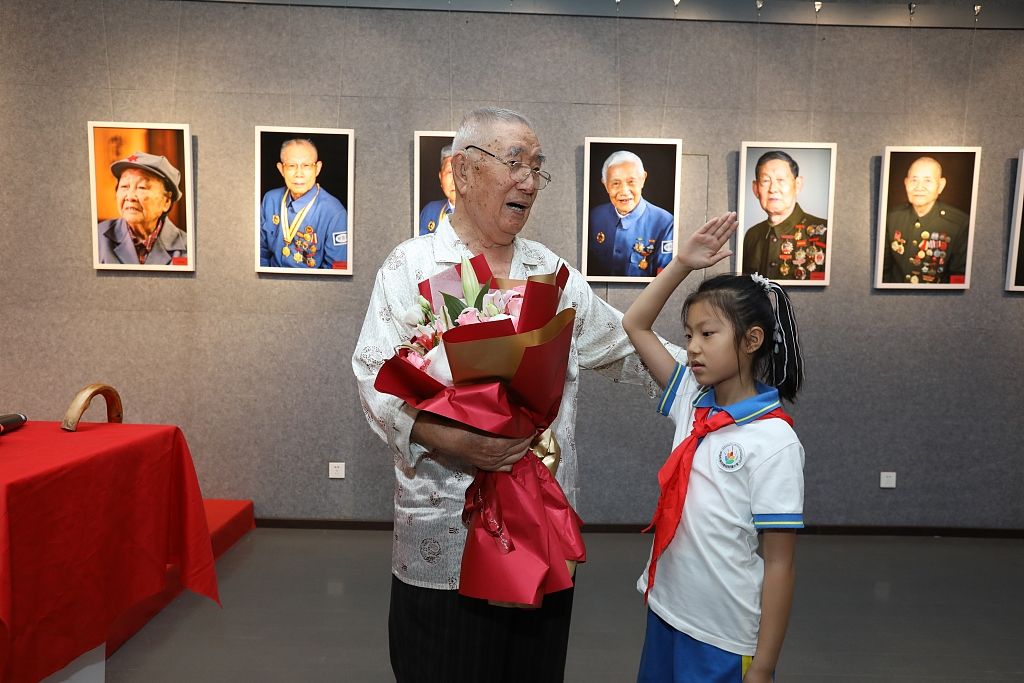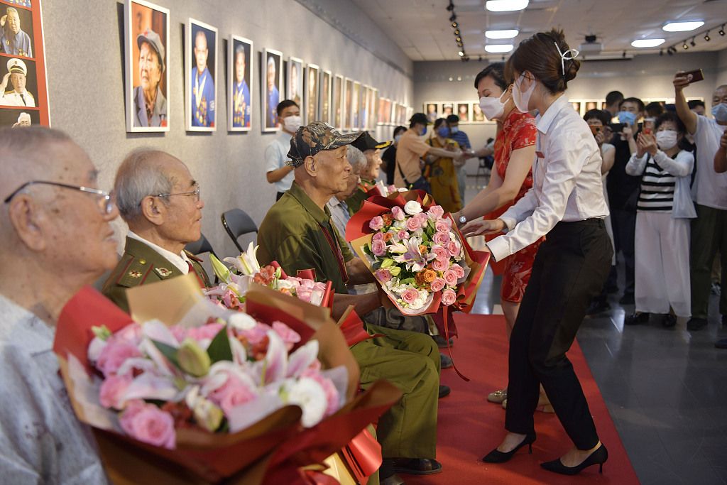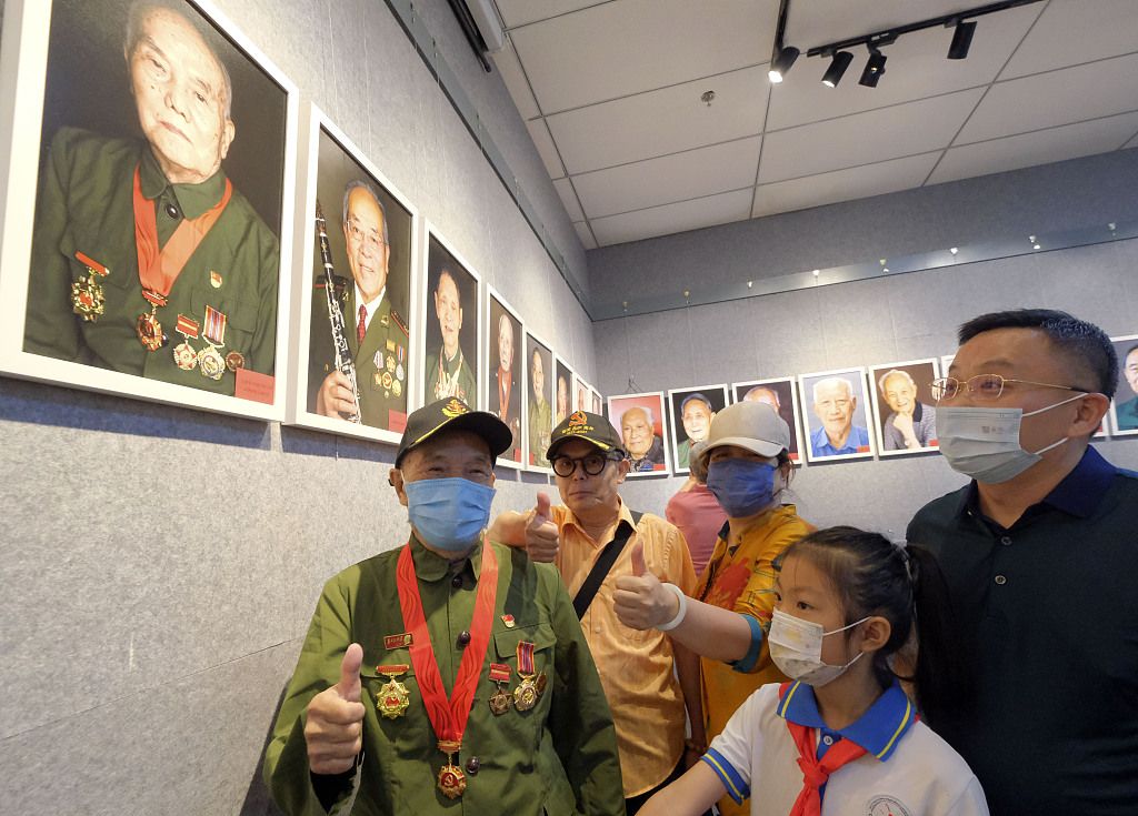 2022年8月1日,北京,《老兵记忆——郭海鹏眼中的老兵肖像作品展》开展。八路军老战士曲琪玉、志愿军老战士高明道、罗玉义、新四军老战士陈长江、志愿军老战士唐能志(从左至右)五位共和国老兵到场参观。