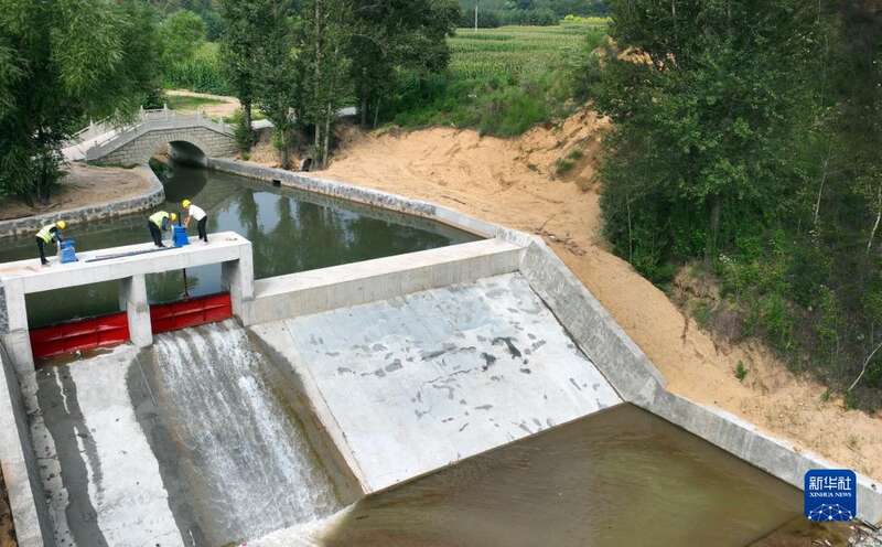 工作人员在榆阳区西沟村疏干水的干渠上为农田灌浇引水(7月31日摄,无人机照片)。 新华社记者 陶明 摄