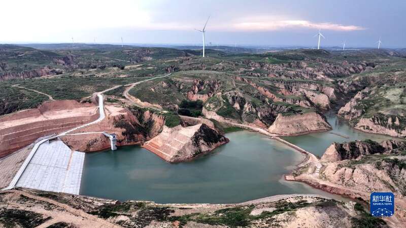 西尧调蓄水池(7月30日摄)。这是榆神矿区金麻片区煤矿疏干水综合利用项目的一部分,包括输配水管道、调蓄水池、调蓄塘坝工程等。