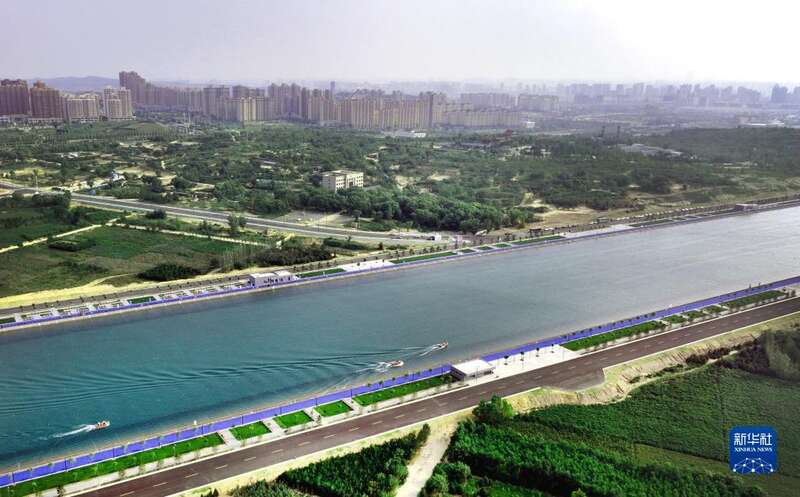 陕西煤业化工集团曹家滩煤矿疏干水调蓄池(7月30日摄,无人机照片)。该项目集生态治理、人文景观、游览休闲于一体,并为采煤塌陷区修复进行生态补水。 新华社记者 陶明 摄