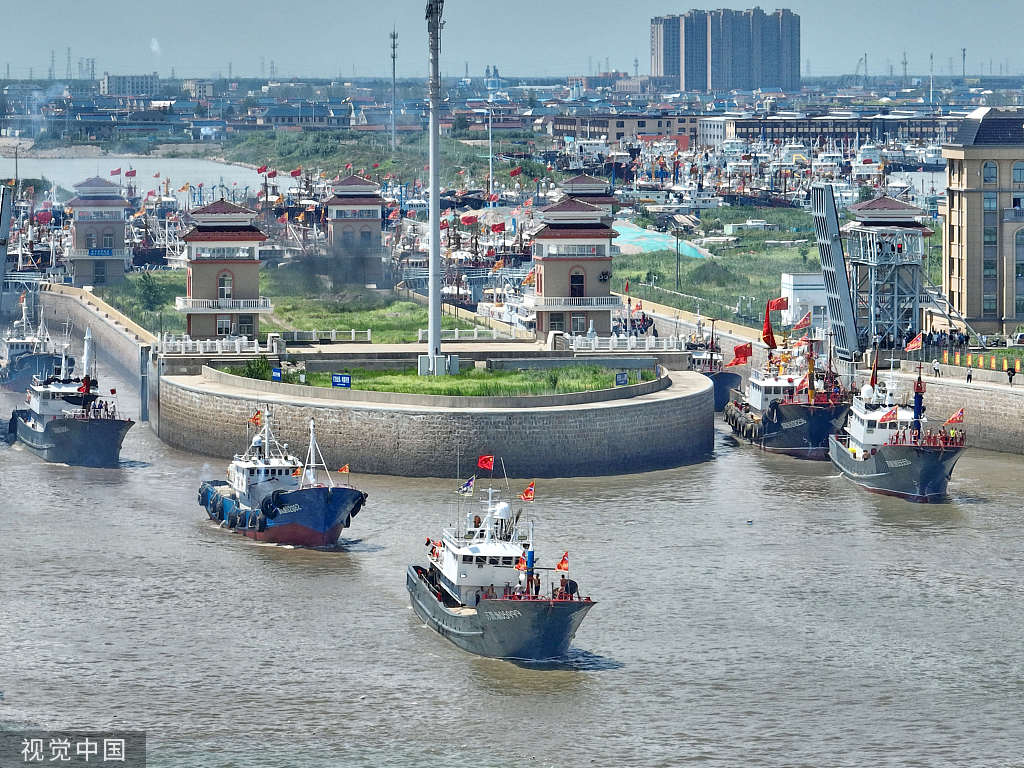 2022年8月1日,江苏连云港,赣榆区青口中心渔港的渔船驶往黄海海域进行捕捞作业。