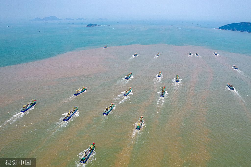 2022年8月1日,浙江省舟山市,沈家门港内数千艘渔船在渔政船的引导下,扬帆驶过朱家尖大桥,前往东海渔场进行捕捞。