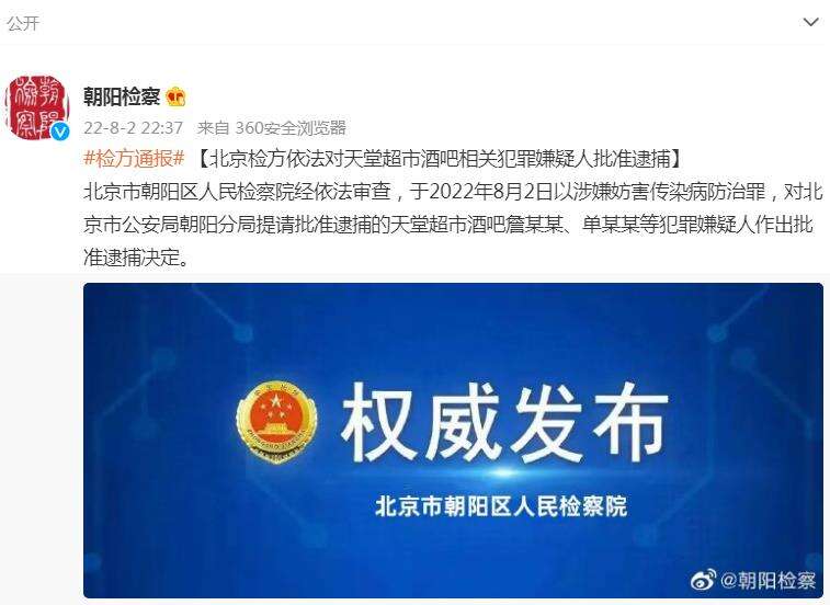 中新网8月2日电 据北京市朝阳区人民检察院官方微博消息,北京市朝阳区人民检察院经依法审查,于2022年8月2日以涉嫌妨害传染病防治罪,对北京市公安局朝阳分局提请批准逮捕的天堂超市酒吧詹某某、单某某等犯罪嫌疑人作出批准逮捕决定。