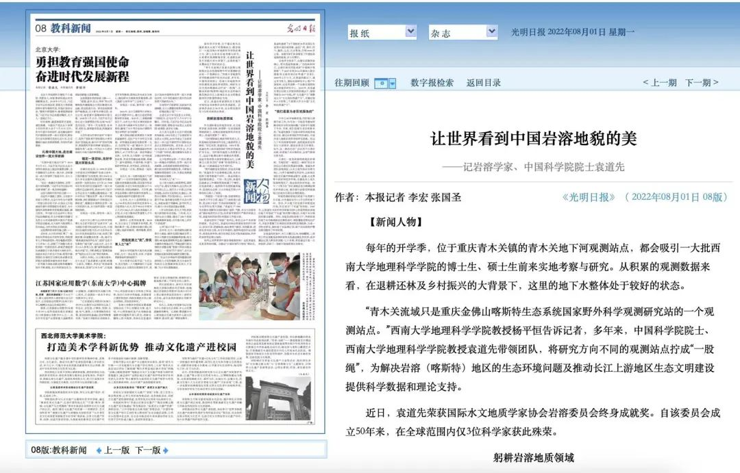 8月1日,《光明日报》第八版报道西南大学袁道先院士躬耕地质岩溶研究七十载如一日的艰辛历程与动人故事。可以说,此次报道的题目“让世界看到中国岩溶的美”,即为对袁道先院士一生奉献给地质研究的最好概括,也是他毕生以之不断奋进突破的信条和钟爱。