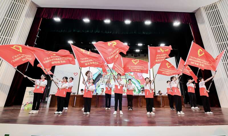 2022年广东高校毕业生志愿服务乡村振兴行动中的14个地市服务队代表挥旗。团广东省委供图