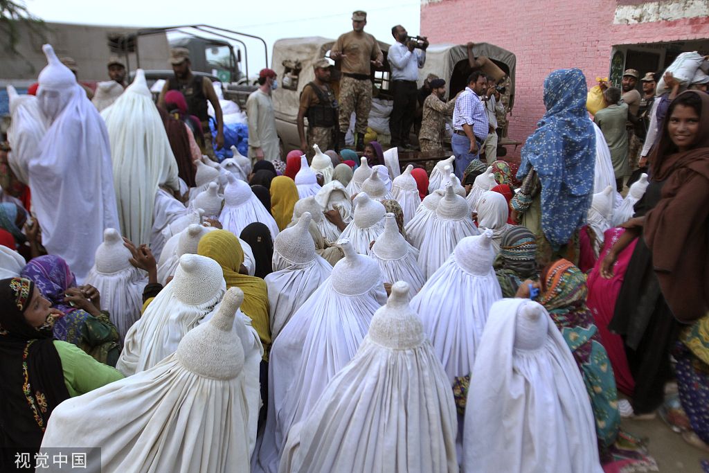当地时间2022年8月2日,巴基斯坦俾路支省西南部杰哈尔马格西地区的甘达瓦镇,当地居民在被洪水破坏的房屋附近领取救援物资。