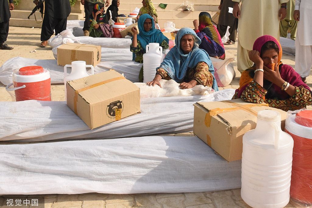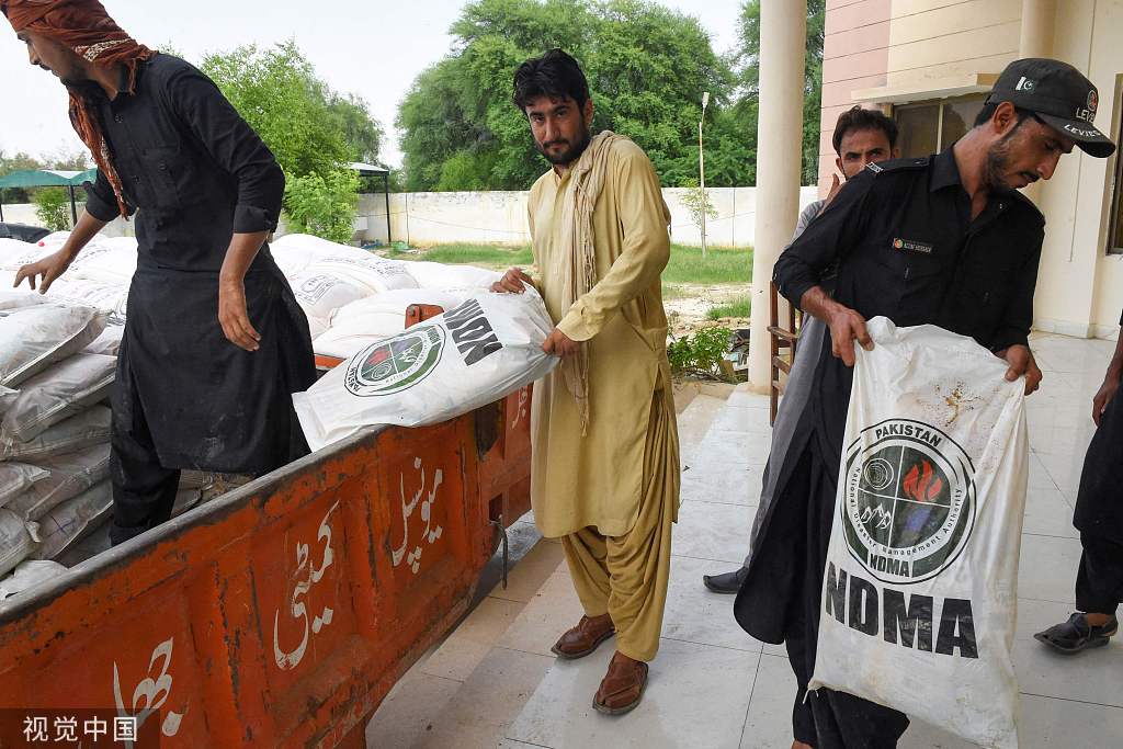 当地时间2022年8月2日,巴基斯坦俾路支省西南部杰哈尔马格西地区的甘达瓦镇,工作人员为受灾群众卸载国家灾害管理局的救灾物资袋。