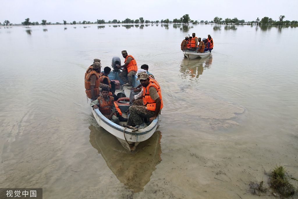 当地时间2022年8月2日,巴基斯坦中部的拉詹普尔地区,巴基斯坦军队士兵从洪水地区疏散村民。