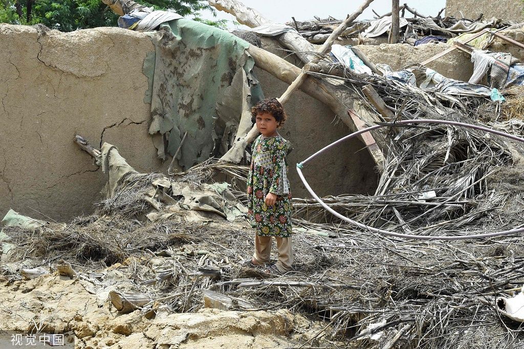 当地时间2022年8月2日,巴基斯坦西南部俾路支省杰哈尔马格西地区,一名女孩站在洪水灾区甘达瓦镇被毁的泥屋废墟前。