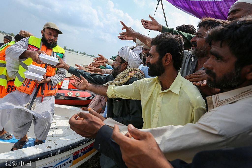 当地时间2022年8月2日,在巴基斯坦旁遮普省拉金普尔区,一名志愿者向受灾群众分发食品。