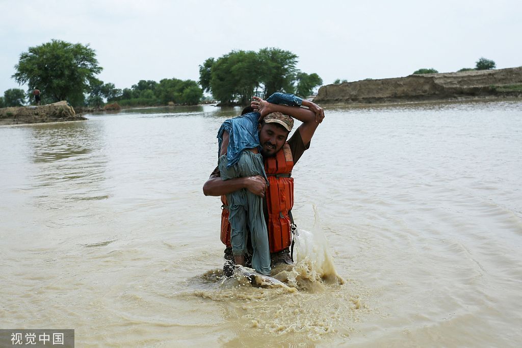 当地时间2022年8月2日,在巴基斯坦旁遮普省,一名巴基斯坦士兵从洪水灾区拉金普尔区救出一名儿童。