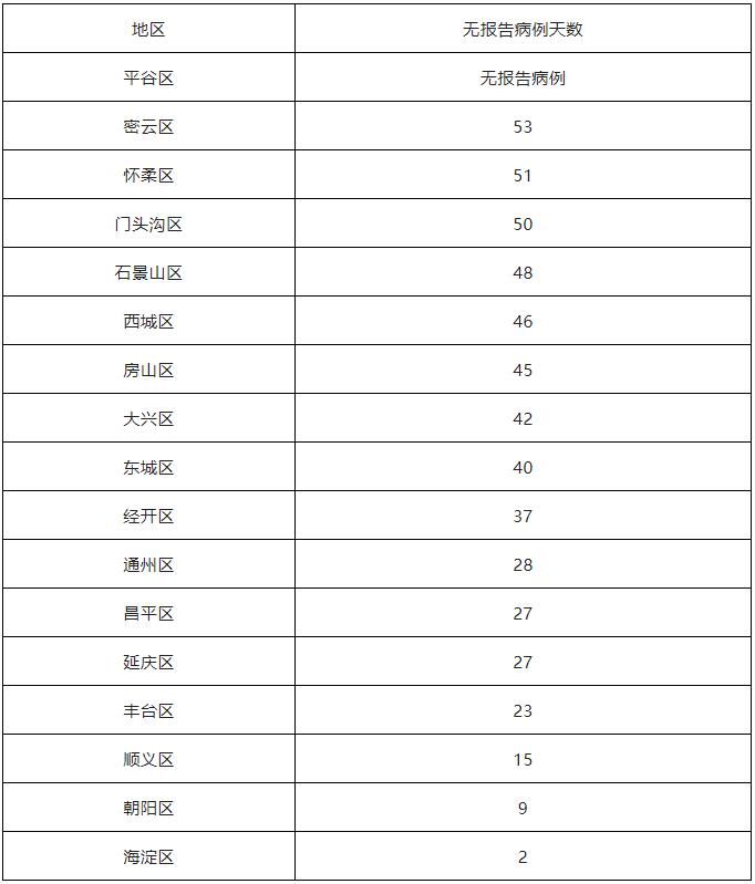 全市16区和经济技术开发区无报告病例天数情况