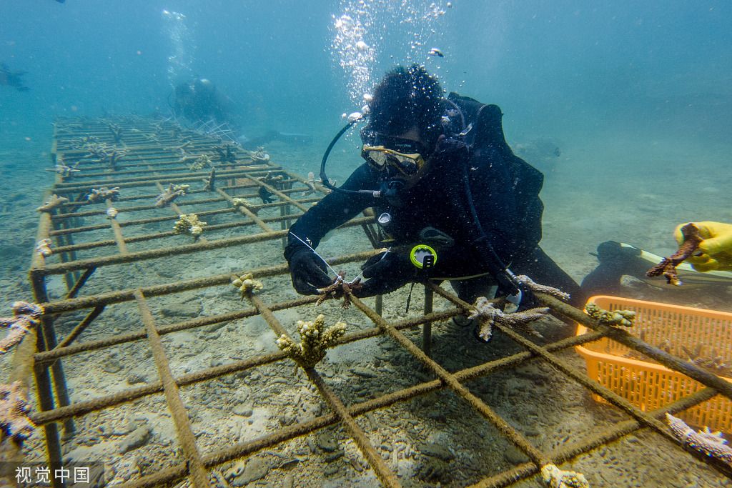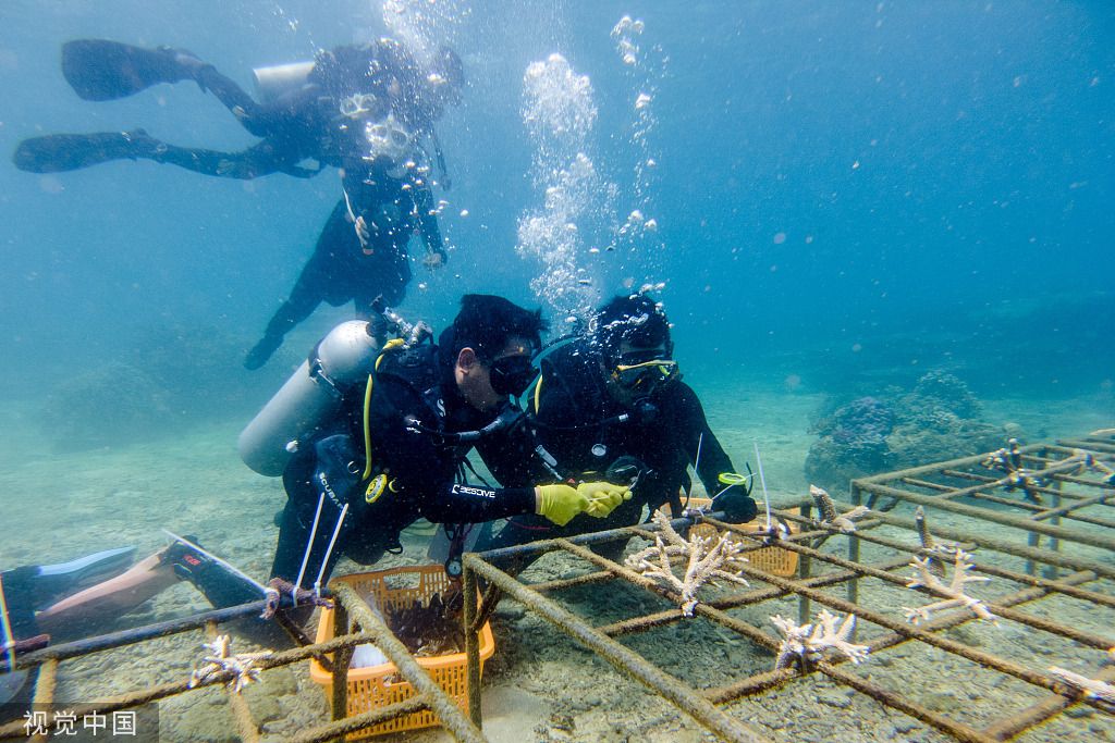 2022年8月3日,海南陵水潜水节启动,参与嘉宾在分界洲岛附近海域进行海底珊瑚移植与观摩。