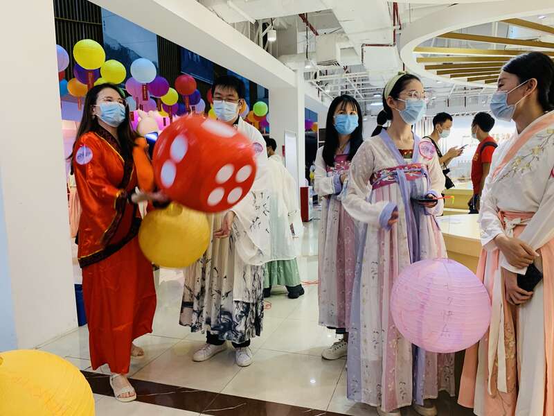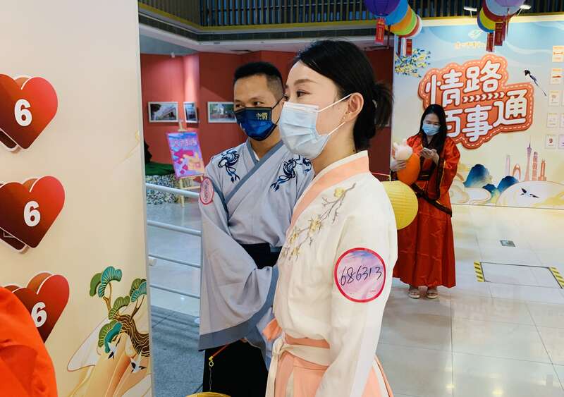 中国青年报客户端广州8月4日电(中青报·中青网记者 林洁)今晚,在千年古道上的广州市青年文化宫,上演了一场“花城有爱·七夕传情”古风相亲会。单身青年一秒“穿越时空”,他们身着汉服,化身翩翩佳公子与如花美娇娘,结对参与投壶、蹴鞠等传统趣味游戏,在玩乐中拉近彼此间的距离,沉浸式体验别样的古风相亲交友会,感受优秀传统文化。