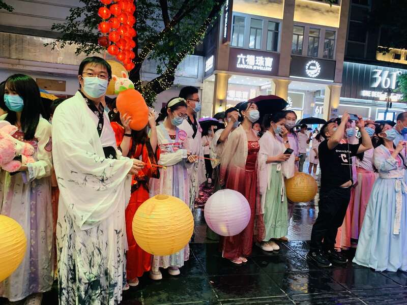 古风青年在千年古道上欣赏橱窗剧场节目。中青报·中青网记者 林洁/摄