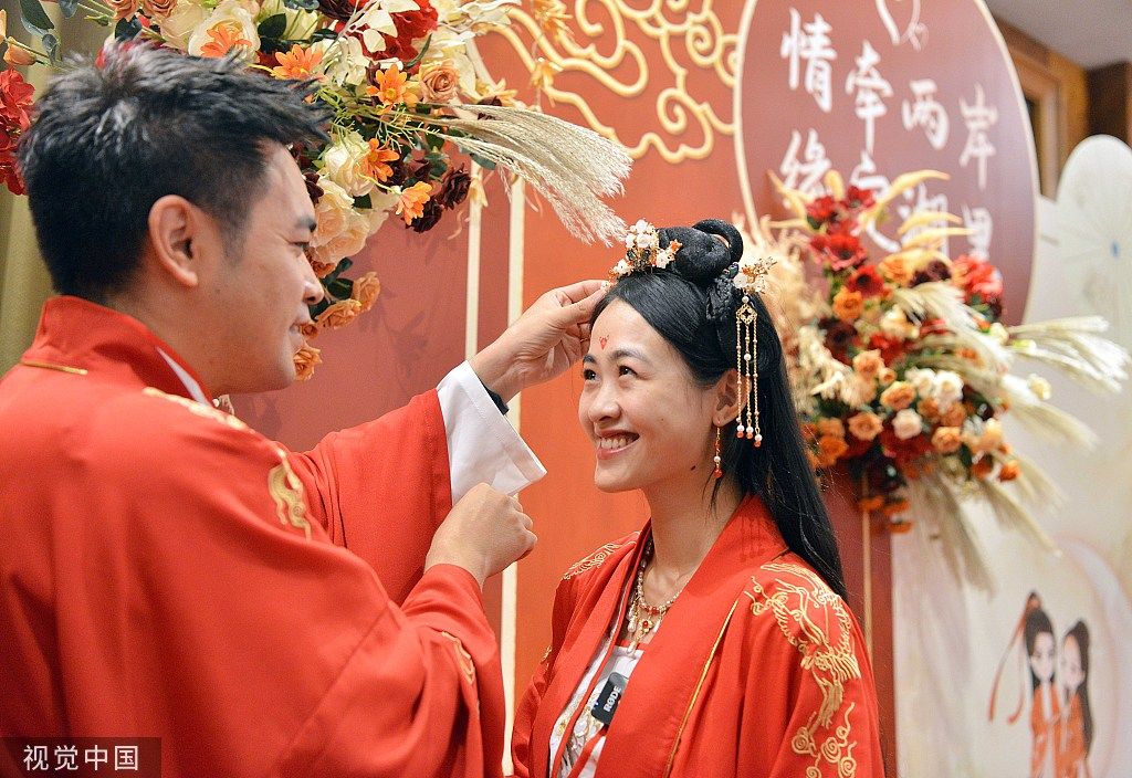 2022年8月4日,厦门,新郎李鹏飞正在为来自台湾的新娘周姿绮整理发饰。当日,适逢农历七夕节,由厦门市湖里区委台港澳办主办的2022年湖里区首届“海峡两岸七夕牵手会”在福建厦门举行。50对在厦门湖里区生活工作的两岸青年男女,身着汉服一同参加“情牵两岸,缘定湖里”中式传统婚典礼仪,行结婚大礼,见证彼此美好幸福的一刻。每对佳偶中都有一位来自海峡彼岸台湾。 中新社记者 张斌 摄