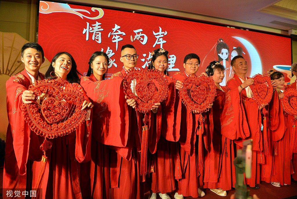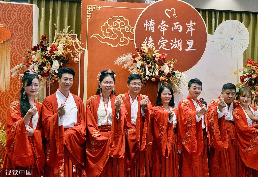 2022年8月4日,厦门,适逢农历七夕节,50对在厦门湖里区生活工作的两岸青年男女,身着汉服一同参加“情牵两岸,缘定湖里”中式传统婚典礼仪,行结婚大礼,见证彼此美好幸福的一刻。每对佳偶中都有一位来自海峡彼岸台湾。图为身着汉服参加2022年湖里区首届“海峡两岸七夕牵手会”活动的佳偶们聚在一起拍照留念。 中新社记者 张斌 摄