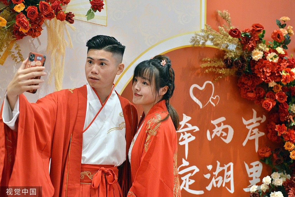 2022年8月4日,厦门,适逢农历七夕节,50对在厦门湖里区生活工作的两岸青年男女,身着汉服一同参加“情牵两岸,缘定湖里”中式传统婚典礼仪,行结婚大礼,见证彼此美好幸福的一刻。每对佳偶中都有一位来自海峡彼岸台湾。厦门姑娘刘昕欣5年前还是厦门理工学院的本科生,作为该校闽台合作交流项目的交换生,她跨海前往海峡彼岸的台湾铭传大学就读,认识了在该校读研究生的台湾男生谢易峻,两人相识相恋。毕业后,谢易峻为爱而来,来到厦门银行工作,如今他们已经办理了结婚登记。图为谢易峻和刘昕欣在2022年湖里区首届“海峡两岸七夕牵手会”活动上用手机拍照留念。 中新社记者 张斌 摄