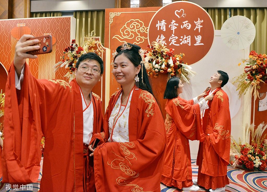 2022年8月4日,厦门,一对参加活动的两岸佳偶在活动上用手机拍照留念。当日,适逢农历七夕节,由厦门市湖里区委台港澳办主办的2022年湖里区首届“海峡两岸七夕牵手会”在福建厦门举行。50对在厦门湖里区生活工作的两岸青年男女,身着汉服一同参加“情牵两岸,缘定湖里”中式传统婚典礼仪,行结婚大礼,见证彼此美好幸福的一刻。每对佳偶中都有一位来自海峡彼岸台湾。 中新社记者 张斌 摄